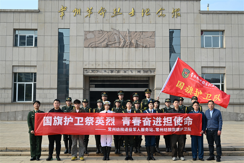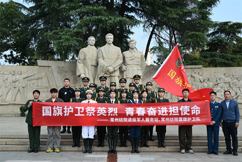 仪式上,校人民武装部干事唐建民给现场的学生上了一堂思政课。他指出,常州是一片英雄沃土,瞿秋白、张太雷、恽代英等革命先辈用生命诠释了信仰的力量。今天站在这里的,是三股青春力量的交汇融合:退役军人服务站的同学曾身披戎装、卫国戍边;国旗护卫队的同学用正步丈量忠诚;服装学院的同学以匠心传承文化。当“国防绿”遇上“国旗红”,再汇入“匠心蓝”,这是使命的接力,更是青春的交响。他向全体同学提出三点希望:一要铸牢忠诚之魂,将个人理想融入国家发展大局;二要练就过硬本领,精益求精,勇担时代责任;三要带头引领新风,在校园中做爱国爱校的先锋,争做有理想、敢担当、能吃苦、肯奋斗的新时代好青年。他号召同学们将对先烈的崇敬化为奋进动力,发扬学校优良传统,擦亮这三张青春名片,为常州发展、祖国富强贡献青春力量。